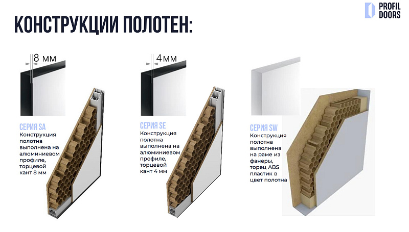 Серия SA / SE выполнена на алюминиевом профиле с торцевым кантом 8 мм / 4 мм, а серия SW - на раме из фанеры с торцом из ABS-пластика в цвет полотна.